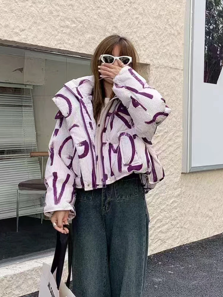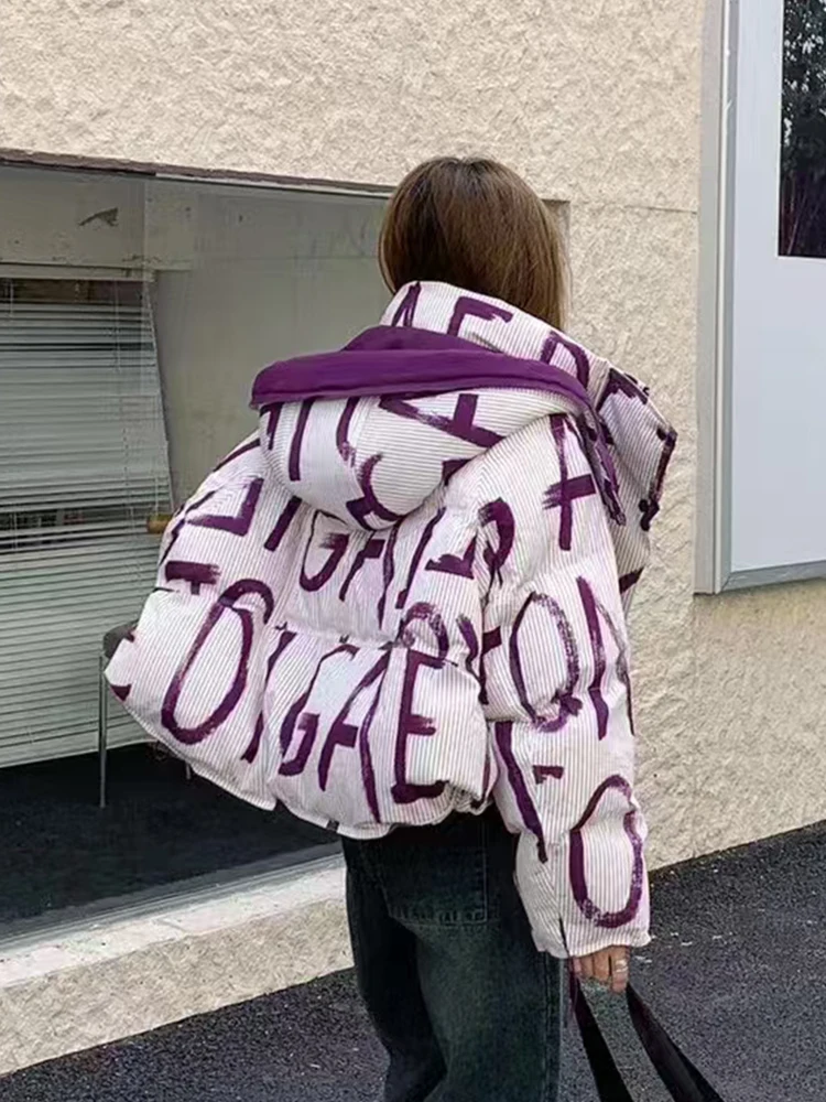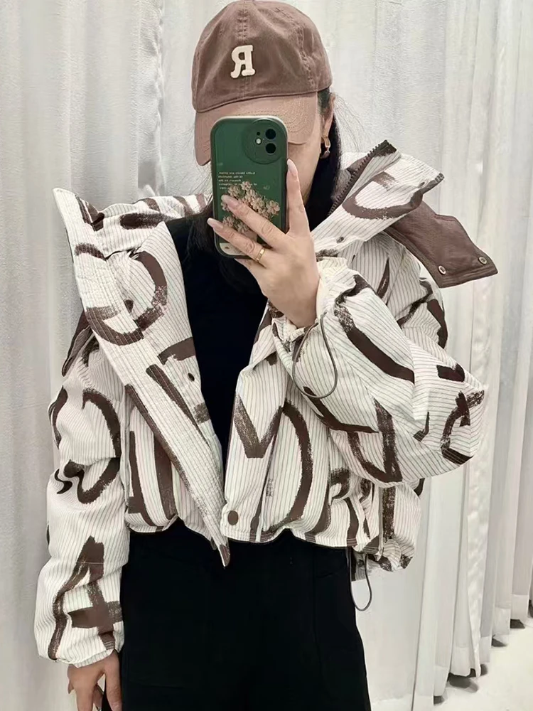 Letter Print Street Short Hooded Coat White Duck Down Jacket