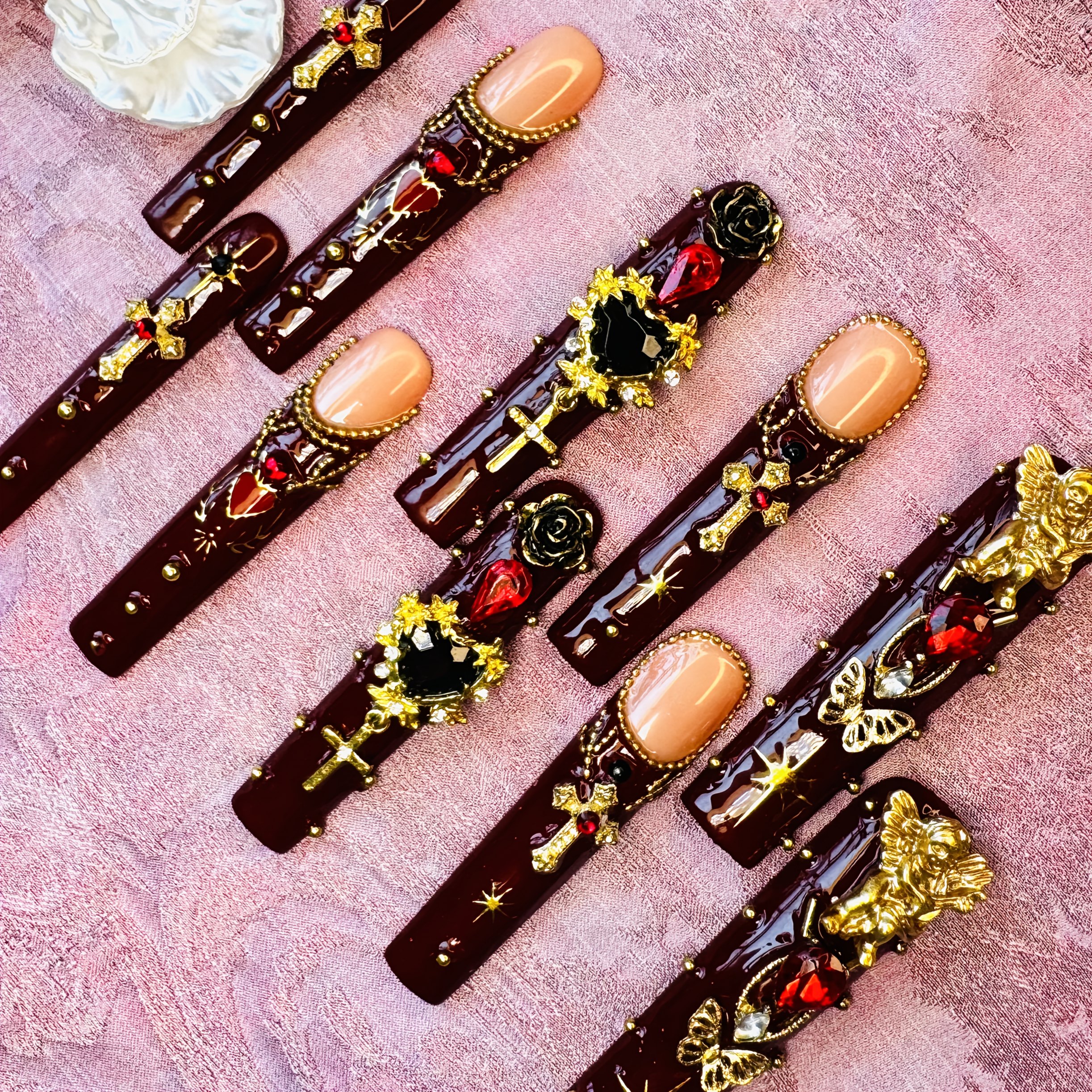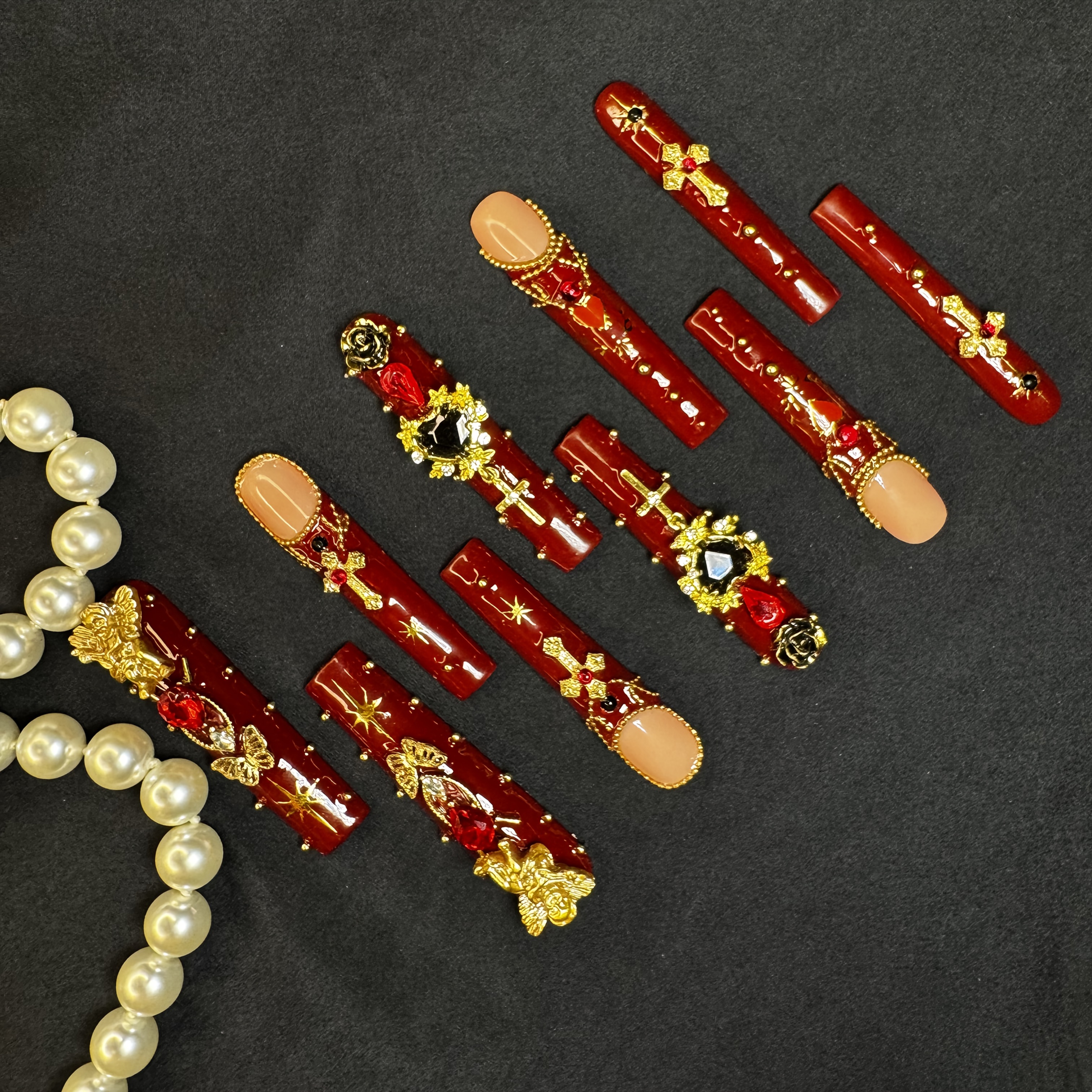 Elevate your nail game with this 10pcs Handmade Press-On Nails Kit! Crafted from acrylic, these long coffin-shaped nails exude gothic charm. Adorned with sparkling rhinestones, striking red & Golden cross-heart decor, they’re perfect for a bold salon-worthy DIY look.Ideal for daily edge, parties (Halloween included!), or as a unique gift for women. Comes with a free nail tool set for easy application. Elegant, fashion-forward design—great for anyone loving eye-catching, statement-making fake nail