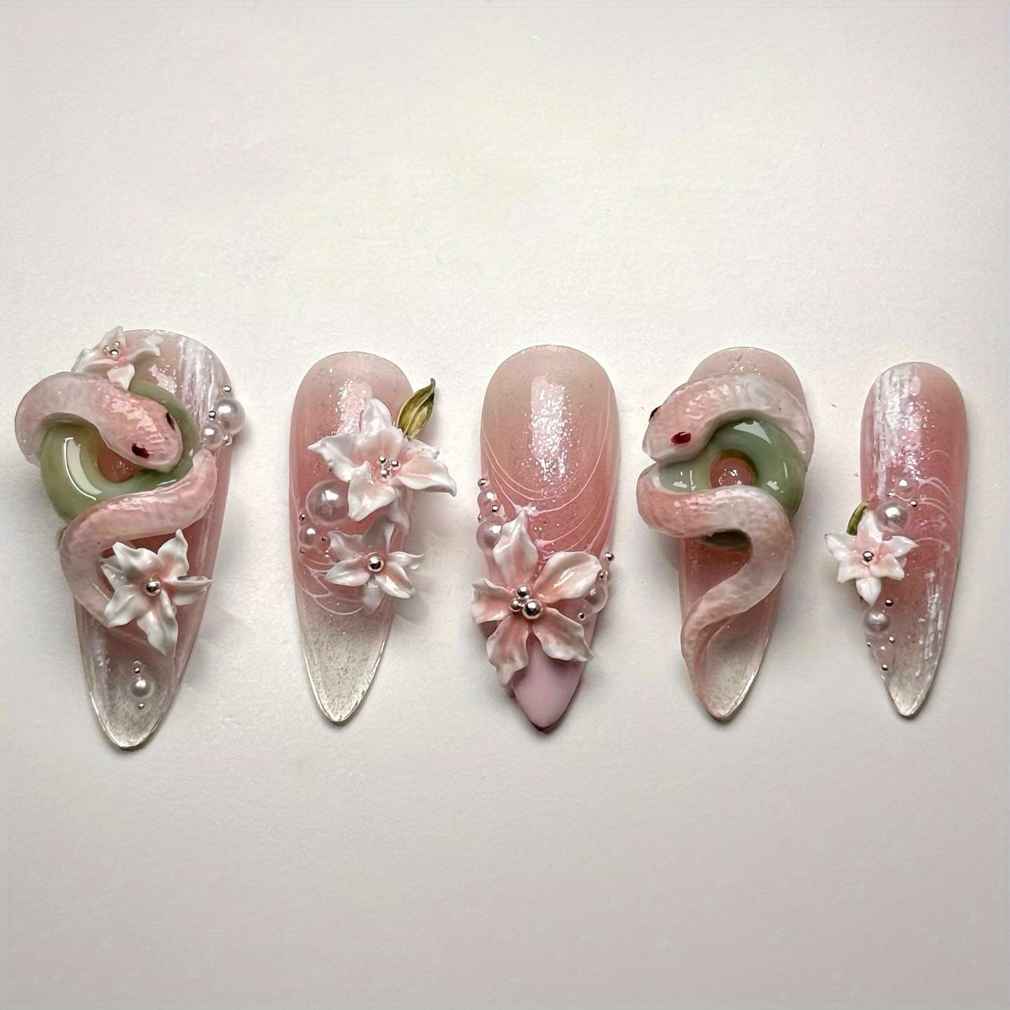 10pcs Handmade 3D Press-On Nails Almond Shape Short Length - Sweet & Edgy Snake & Flower Relief Designs with Glitter 3D Layered Nail Art Suitable for Women's Daily Wear, Parties, Christmas Gift (Handmade Press-On Nails)