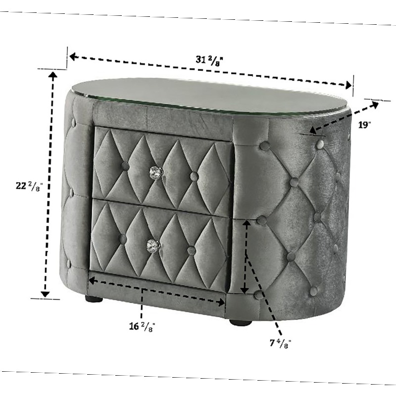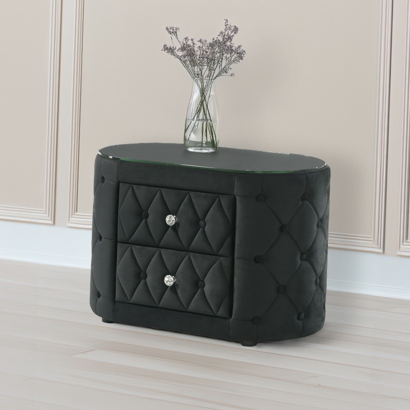 Luxurious 1pc Oval Nightstand with Plush Upholstery 8mm Tempered Glass Top Rounded Sides Two Storage Drawers Sparkling Knobs en Bedroom Furniture in Elegant Black Finish for Modern Home Decor and Cozy Bedroom Ambiance