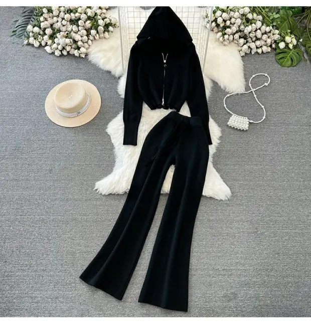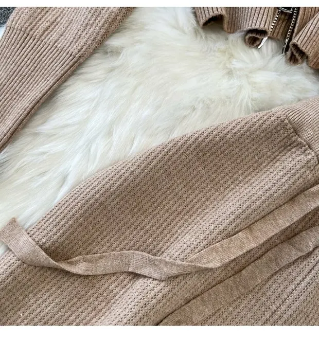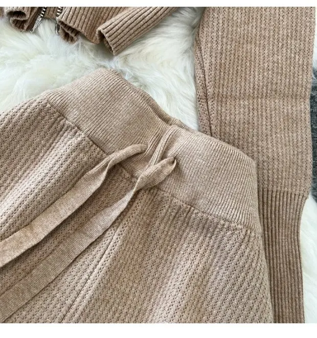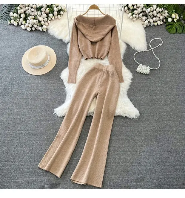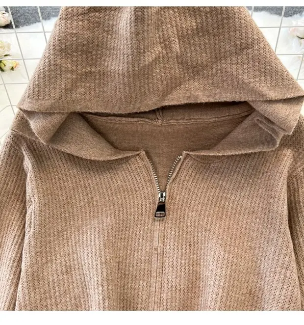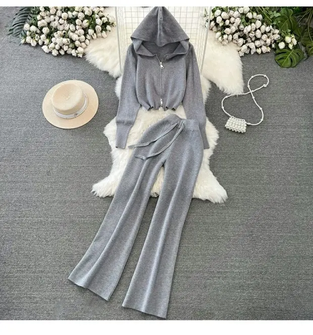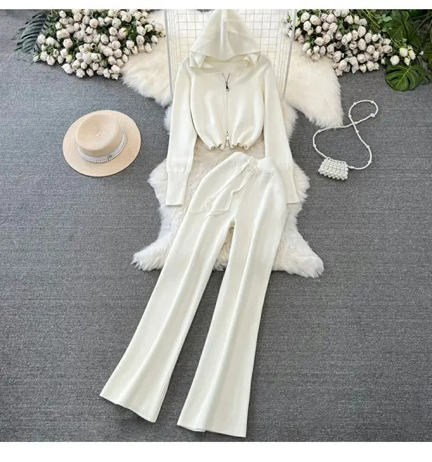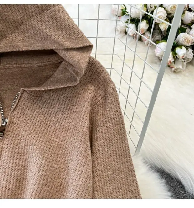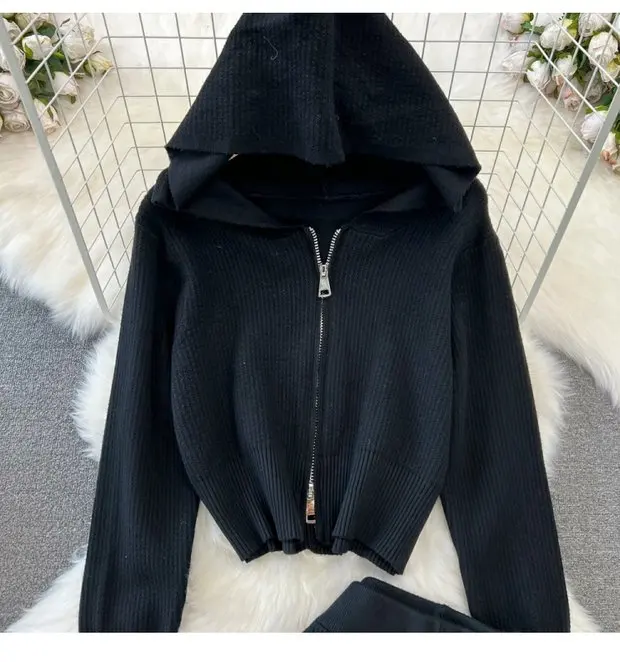 Zipper Hooded Slim Fit Knitted Sweatshirt Set