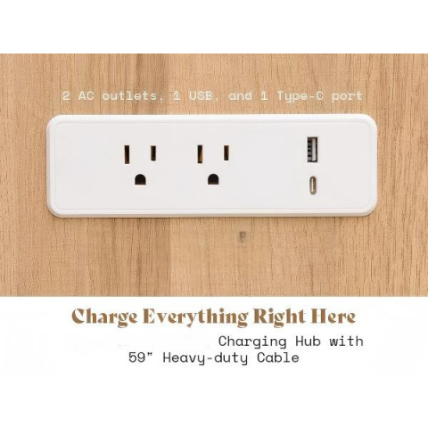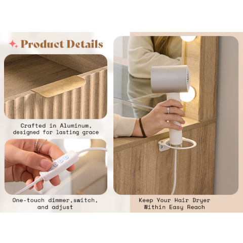 This wooden dressing table features two AC sockets, one USB port, and one Type-C port for charging your devices like phones, tablets, or hair styling tools. The integrated holder for the hair dryer ensures that everything is within reach as you prepare.