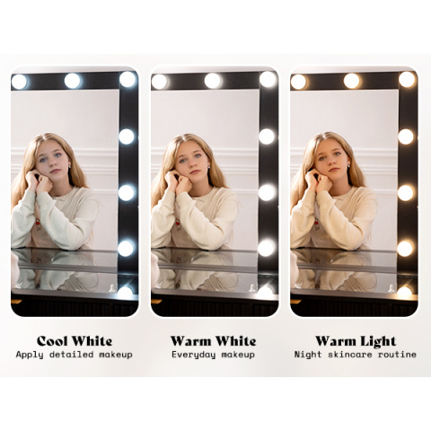This vanity mirror features adjustable lighting with three color settings: Warm, Natural, and Cool. You can change the mode by pressing a button and adjust the brightness smoothly by holding it. It's ideal for applying makeup at any time.
