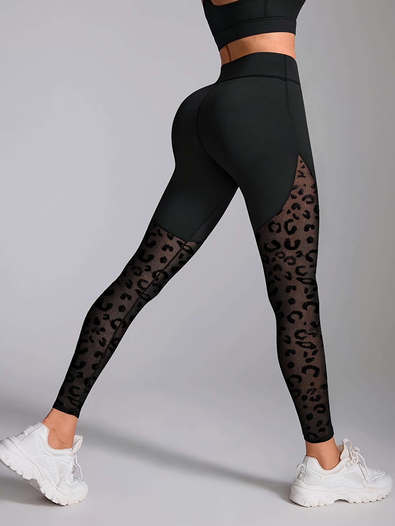 High-Waisted Leggings with Mesh Panel & Leopard Print