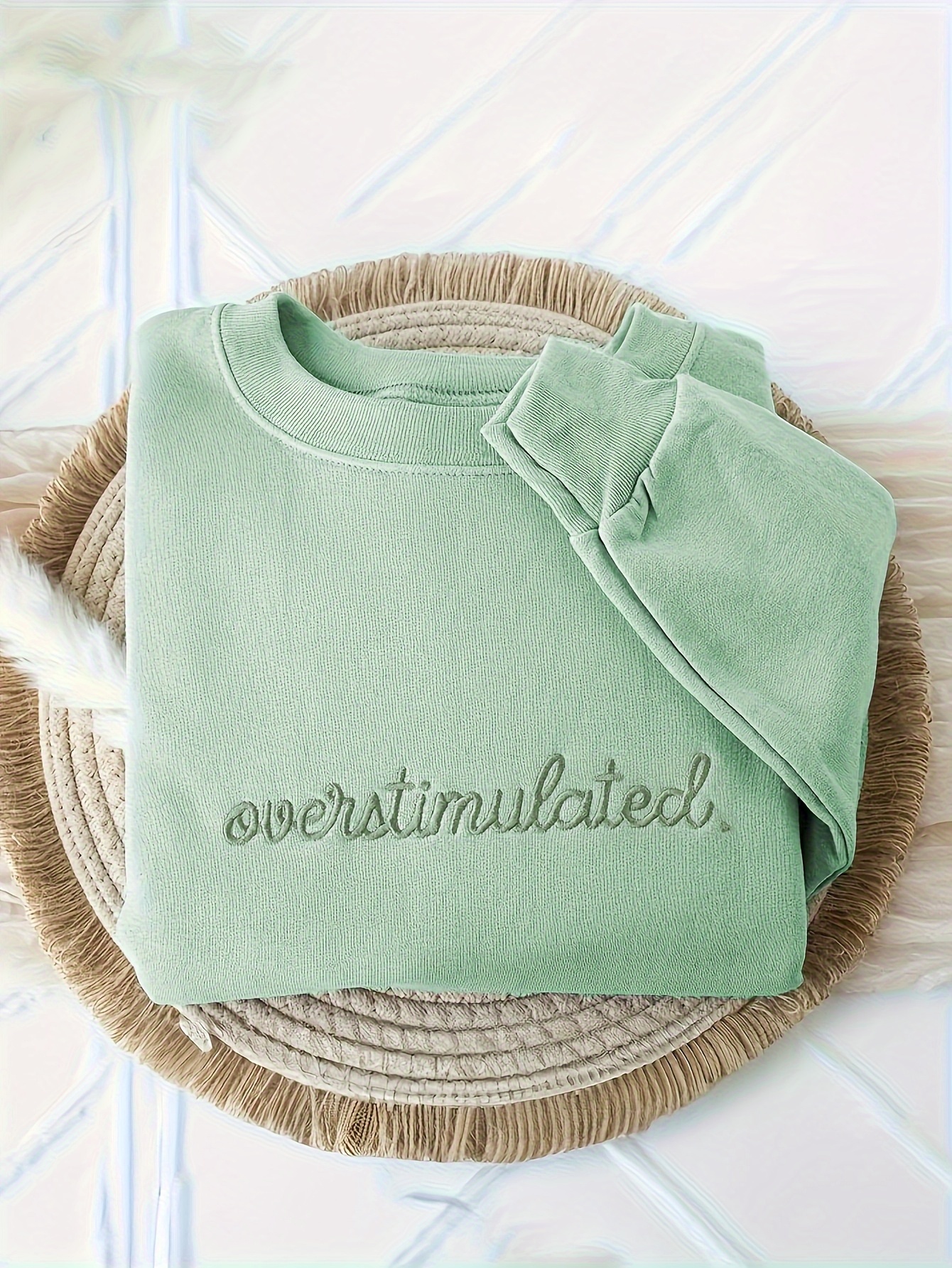 Women'S Sporty Casual Letter Print Crew Neck Sweatshirt - Cozy Fleece-Lined, Machine Washable, Black with "OVERSTIMULATED" Design, Perfect for Fall/Winter, Casual Sportswear | Relaxed Fit Sweatshirt | Machine Washable Top, Sw
