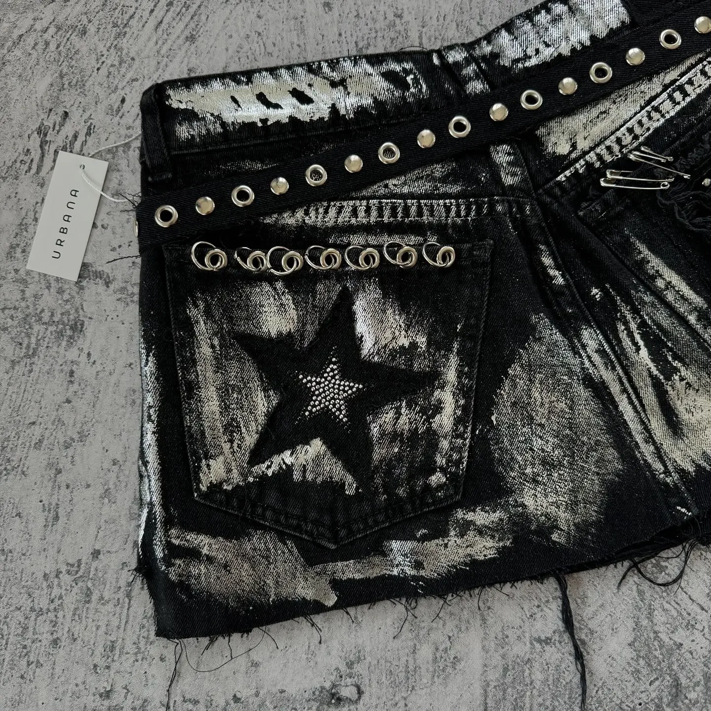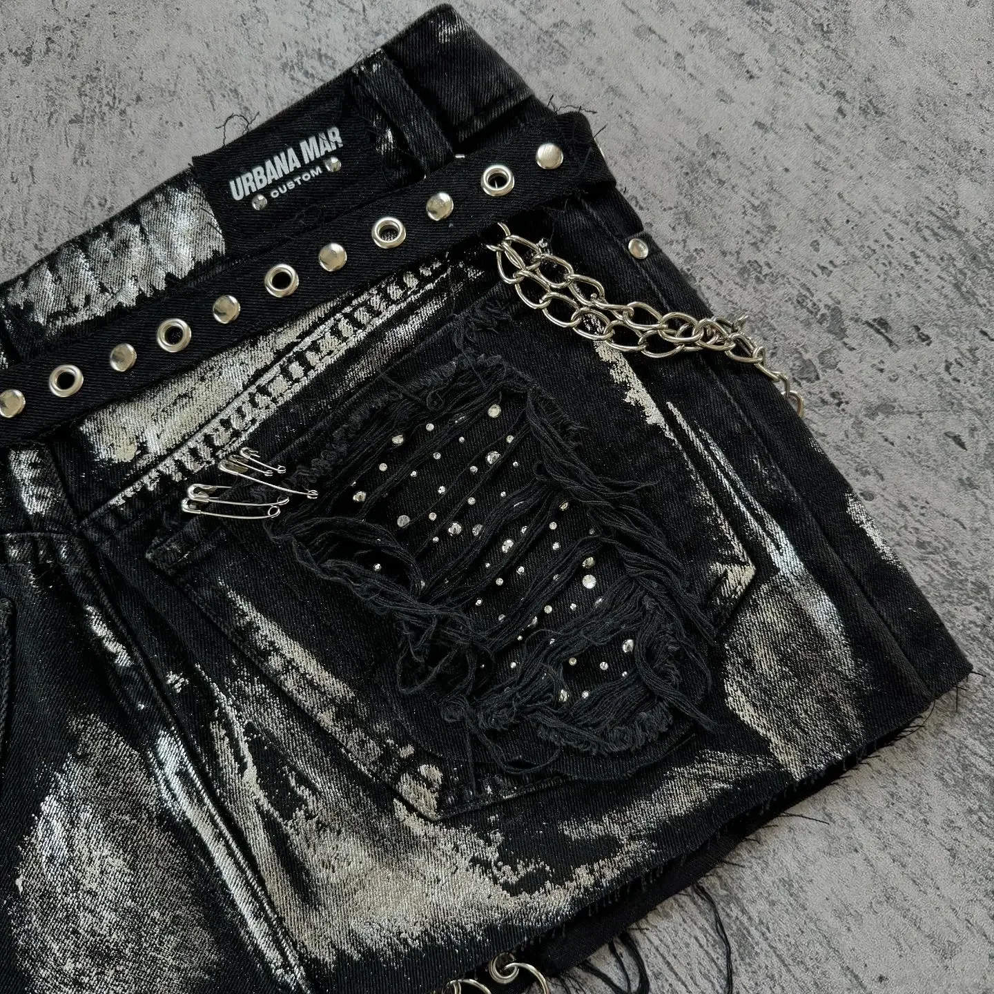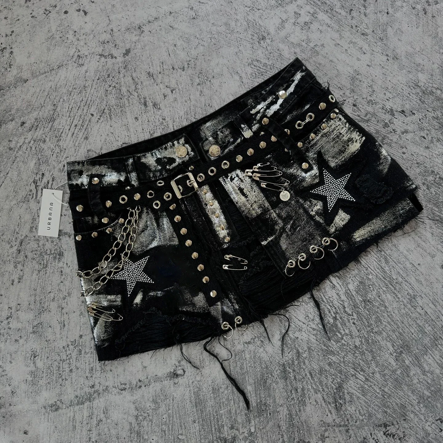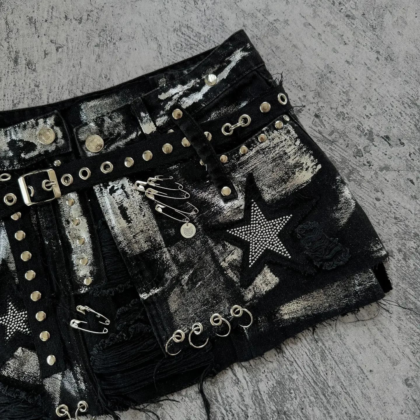 Y2k Streetwear Short Skirt Women Retro Washed Rhinestone Sequin Loose Denim Shorts Gothic Harajuku High Waist Slim Mini Skirt